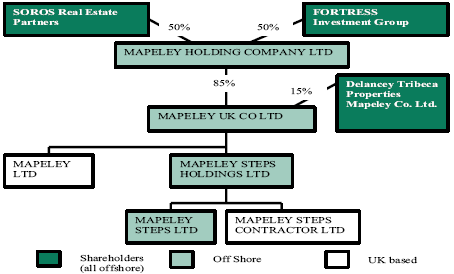 5. The freehold and long-leasehold properties transferred under the deal are held by a subsidiary company based offshore (Mapeley STEPS Limited - Figure 3). As a result, gains from selling the properties would not be subject to UK tax. Furthermore, as Mapeley's shareholders are also based offshore, they will not be liable to UK tax if they sell their shareholdings. Mapeley estimated that if it had been required to hold the properties onshore, its price would have increased by £55 million to cover extra UK tax that may have been due.6
