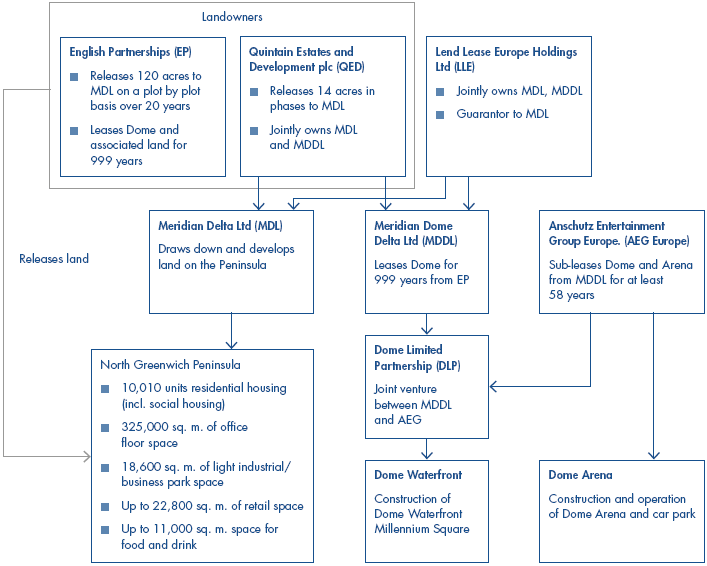 1.4 Figure 4 on page 14 outlines the levers through which various parties and stakeholders can control this complex project. The levers encompass both the legal contracts as well as wider means of influencing the project. EP's leverage over the project and its returns is based on its role in approving business plans, submissions to the Council for the consent to develop land and in scrutinising costs incurred by MDL (the latter function relates to its economic interest in the project under the profit sharing arrangement - see Part 3). Greenwich Borough Council provides the overall planning consent for work to take place.