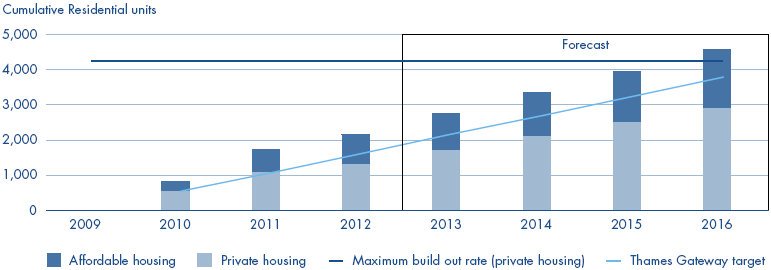 2.13 Progress on this development also contributes to the Department's targets for housing development within the Thames Gateway. The Thames Gateway Interim Plan targets 100,000 new homes to be built by 2016 within the London portion of the Thames Gateway. This project has the potential to contribute 4,250 of these units.20