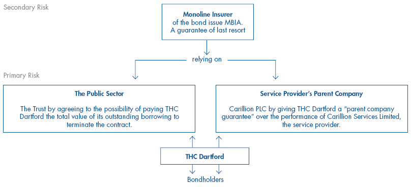NOTE THC Dartford's ability to repay the bondholders is safeguarded by guarantees given by Carillion PLC and MBIA, the monoline insurer. The Trust's obligation is particularly important as it has agreed to the possibility of being liable to pay THC Dartford the full value of its outstanding borrowings in the event of contractor default. | |