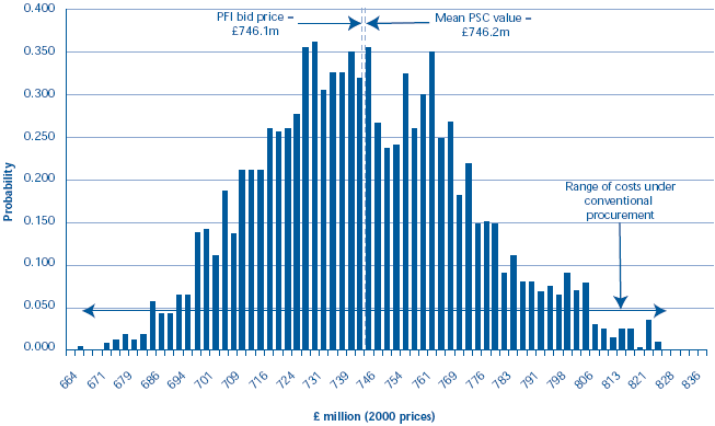 2.52 Where such a large number of risks and variables are involved in a project a single value output from a PSC will give a misleading impression of the accuracy of the estimate of the cost of the project. Depending on how risks materialise and interact with each other during the life of the project, the actual eventual cost could fall within a potentially wide range of values. It is possible to use a technique known as Monte Carlo simulation to estimate the probabilities of each of these values occurring and to plot this as a probability distribution.