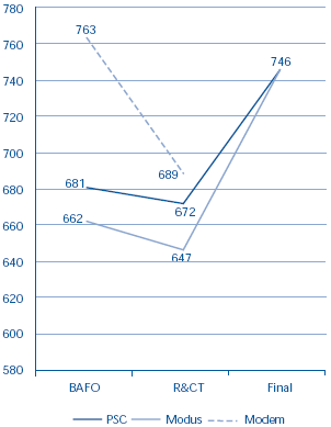 | NOTE 1. This figure shows that Modus' price was estimated to be £25 million lower than the PSC when it became preferred bidder, but this estimated cost difference in favour of the PFI option had reduced to £100,000 by financial close. |