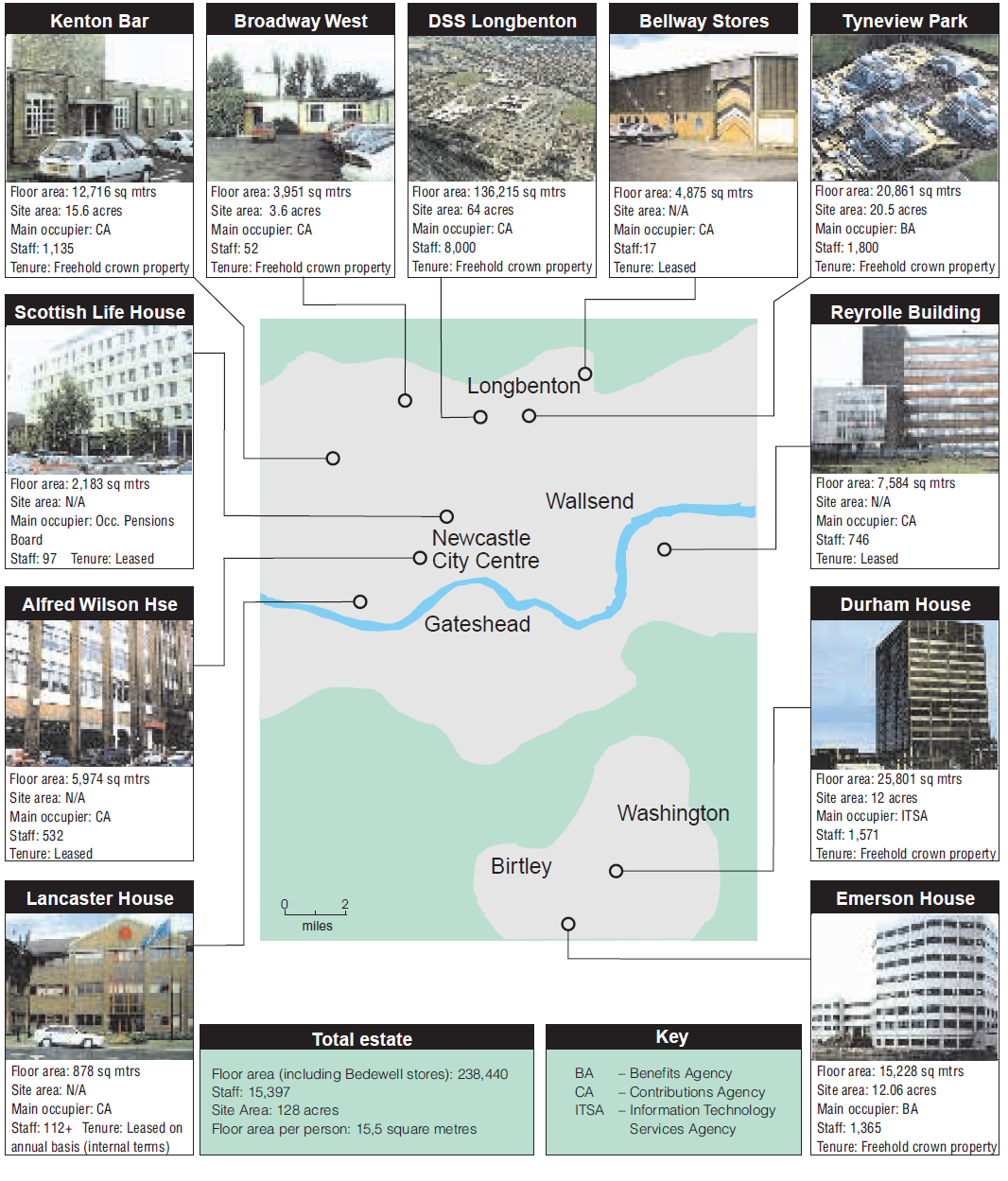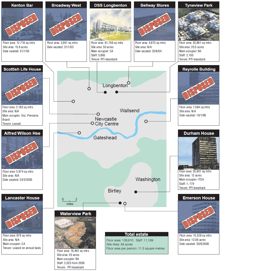 1.12 An illustration of how the Newcastle Estate is to be changed over the redevelopment phase of the project is at Figures 3 and 4. The latest estimate of the number of staff that may need to be accommodated in the redeveloped estate is some 13,200 by 2003/2004. This compares with the revised occupancy levels of 11,466 agreed in April 1998 and the estimate of 10,700 on which the deal was based. At present the current plans can accommodate 11,946 staff. This indicates that the Departments may require further space in the Newcastle area in the future, and the National Insurance Contributions Office are currently conducting for the Departments an evaluation of options for meeting this requirement. These could include retaining existing leased properties, acquiring extra space and making more effective use of the accommodation through improved working practices.