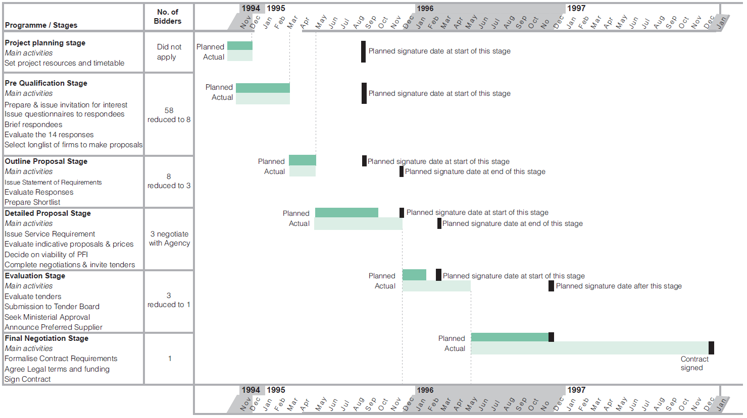 c) After the appointment of Newcastle Estate Partnership as preferred bidder in June 1996, signature of the contract was deferred on four further occasions. In the original project timetable it had been assumed that contract signature would follow the selection of supplier within several weeks. In the event this stage required 18 months of difficult and complex negotiation, including five months in which NEP concluded obtaining external finance for the deal.
