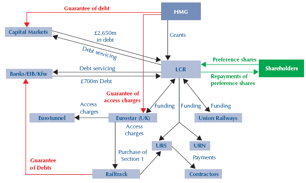 2.13 One of the Department's objectives for the restructuring of the deal was to remove the existing shareholders from management control but require them to maintain an economic interest in the success of the project. The original shareholders with a continued fixed interest in LCR have converted 95 per cent of their equity stake into preference shares. The preference shares accrue interest at 7 per cent a year from February 1999 (Financial Close 2) and will be repaid 50 per cent on completion of Section 1 (the scheduled repayment for this stage will be £37million, including the rolled up interest) and 50 per cent on completion of Section 2. The remaining 5 per cent of their original investment will remain at risk as ordinary shares. LCR's original shareholders did not therefore lose their original investment and did not contribute any further equity to the project (Figure 14).