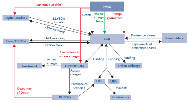 2.29 LCR had to consider whether to take action to hedge against future changes in interest rates. Under the terms of the agreements entered into between LCR and Railtrack, LCR has the equivalent of a fixed interest rate receivable in the form of Railtrack's obligation to pay 7 per cent a year on monies provided by LCR to fund the construction of Section 1. The underlying source for this lending is the £1,000 million in proceeds from the issue by LCR of the GGB at a fixed interest rate of 4.75 per cent a year maturing in 2010. However, the actual amount of interest paid by Railtrack to LCR is not fixed and will depend on progress against the construction profile of Section 1 and the exercise of the flexibility allowed to Railtrack in the agreement with LCR governing the timing of the sale of Section 1.