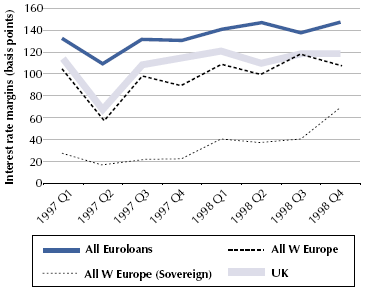 8. Average pricing in the Euro-loan market has risen in general since the middle of 1997 but the withdrawal and in some cases, exclusion, of many emerging market borrowers during 1997 and 1998 who traditionally borrowed at higher rates disguises the steep rise seen in margins paid by those still active. The sudden pick up in pricing can be clearly seen in the averages for all Western European and all United Kingdom borrowers and is a truer reflection of the market. By the end of 1998, average corporate pricing had risen by almost 65% from a low point in the middle of 1997 (Figure 28).