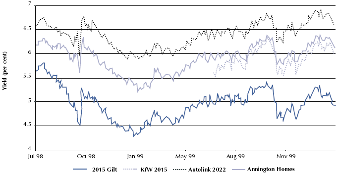 43. Non participants in the market can be shocked by the differential spread between bonds of the same maturity and same credit rating. Figure 33 shows the yields of three AAA bonds relative to the Gilt. (We have illustrated these bonds because they have a similar weighted average life. There is not a suitable range of AAA bonds at 2028-38 maturities).
