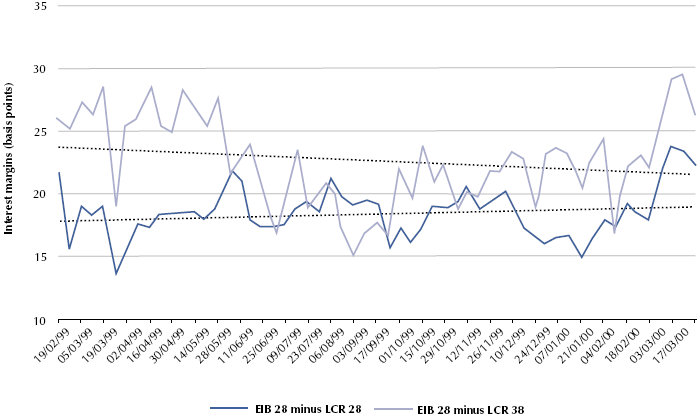 84. Figure 37 overleaf illustrates the relative performance of the long LCR bonds to the long EIB bond. If the margin on bond A narrows relative to that on bond B, in relative terms bond A is said to have outperformed bond B as its price has risen more, or fallen less, than bond B's. In this case LCR 38s have outperformed EIB 28s and LCR 28s have very slightly underperformed over the period.