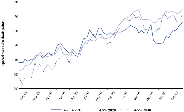 83 Figure 36 overleaf illustrates the performance of the bonds against Gilts in the after market. The widening trend in spread broadly tracks the trend in the sterling swap and AAA corporate bond markets. The 2010 issue appears to have relatively outperformed the others in spread terms. This may in part be due to the fact that swap spreads have tightened at 10 years relative to the long maturities. However, it may also be due to the fact that the 2010 issue was originally placed at a wider spread to compensate investors for the perception that is was the least popular of the three issues.
