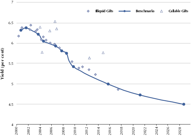 8. All of these features may affect the price of a) all the securities in the market, b) those with a particular maturity or c) an individual bond or Gilt. In the Gilt market, it is possible to identify Gilts with characteristics set out above as the gross redemption yield does not lie on the yield curve (Figure 41 overleaf).