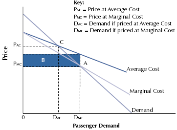 2. However, some public transport schemes - particularly rail schemes - have high initial capital costs and, because of this, marginal cost pricing would lead to the scheme making a financial loss. Figure 43 shows a simplified example where one price is charged for the transport service. The optimal level of service provision is where price equals marginal cost, PMC at point A. However, if the scheme were to be priced at this level, this would result in a financial loss equal to the shaded area B. The Average Cost, which includes the initial fixed costs, is greater than the Marginal Cost of providing the last unit of service, so a financial loss results. The scheme would break even if Average Cost pricing PAC were adopted, point C. But this would mean that DMC - DAC potential rail travellers would be priced off, despite the fact they are willing to pay the additional costs they impose, so this is a less efficient level of service provision. This is the type of situation where the Government may take the welfare decision to pay a grant for the initial fixed costs to allow the operator to price efficiently, or to subsidise the operation of the service in order to prevent the operator making a loss.