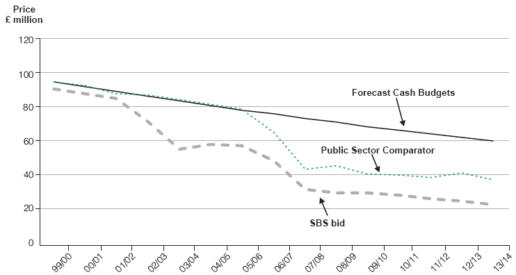 This figure shows that SBS's bid was superior to the Public Sector Comparator, and that both were within National Savings' forecast cash budget | |