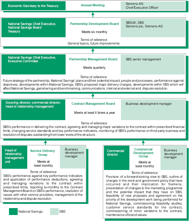 2.9 National Savings and SBS have established a joint governance structure for the contract. The structure comprises three partnership boards, as shown at Figure 7. To monitor performance against the contract on a day to day basis, National Savings has also established a relationship management unit, which includes professionally qualified senior staff who negotiated the contract with SBS and carefully selected people with extensive knowledge of the operational service. The unit has developed a manual of new business management processes and has introduced new business reports to help ensure that the partnership is managed effectively.