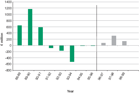 7 As part of the strategic review, Corporate Value Associates calculated that National Savings added value of £1,600 million during the period 1988/89 to 1995/96 (Figure 20), after taking account of running costs and tax foregone on some savings products. The profile of value created demonstrates the characteristics of retail funding described earlier. Value is created mainly in periods of rising interest rates: 1988 to 1990 was a significant period of value creation. In contrast, value was reduced in 1991/92 to 1993/94, a period of falling interest rates. Variable rate products created some £500 million of value and fixed rate products £1,100 million over the cycle.