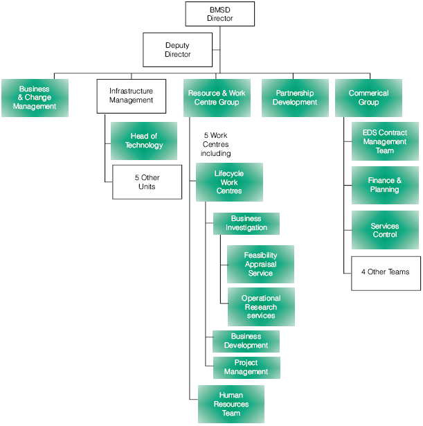 ■ The Commercial Group, which has overall responsibility for the management of the contract and the relationship with EDS. The key units which are involved in commissioning new work are: