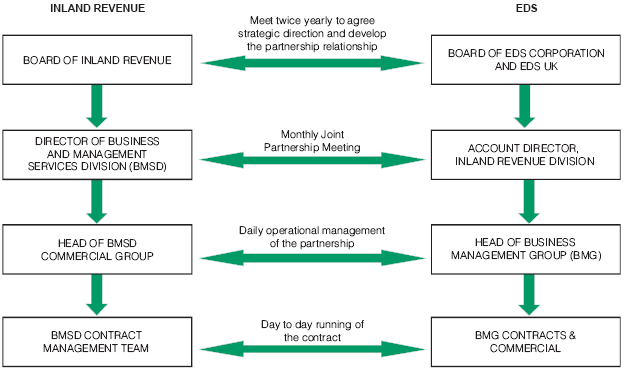 2 The Department considered that this could only be achieved if both parties -EDS and the Inland Revenue - agreed, adopted and maintained common objectives in relation to the work of the Department and their contribution to it. The creation of the partnership between Inland Revenue and EDS stems from, and is based on, this understanding. Important aspects of the partnership include a framework of joint consultative and executive committees, co-location of working groups, and a common approach to business. Inland Revenue senior management have a vision of the relationship and actions that are required to ensure that the partnership delivers the best outcomes for the Department. The success of the partnership owes as much to this vision as to the formal structures.