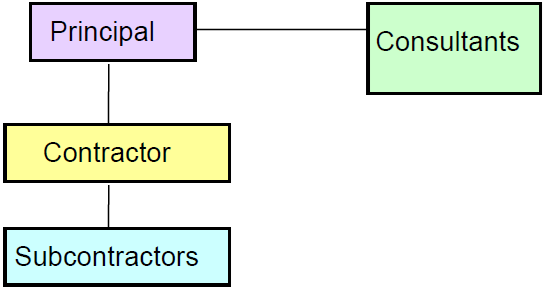 The following figure illustrates the contractual relationship of the principal with the design team and the contractor in a construct-only model.
