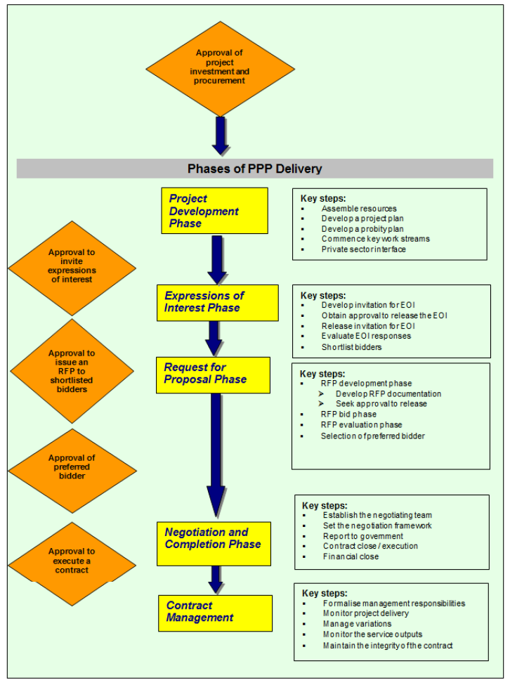 The following flow chart outlines the key phases in delivering a PPP project. Each of these phases is expanded upon in this guidance material.