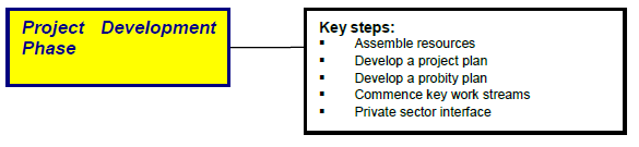 Following endorsement by government of the project and approval of the funding and procurement method, the project is further developed. This requires the assembly of resources and development of the project structure, scope and commercial principles, in readiness for seeking formal market interest.
