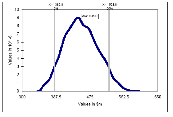 The costs of risks contained in Table 10-4 above are mean estimates (i.e. weighted average) among a range of possible outcomes. It is, therefore, important to focus on the probability distributions generated by the advanced probability valuation technique rather than simply looking at the mean result in isolation. The best way to analyse these results is by looking at the shapes of the distribution curves for retained and Transferred Risk and for the Total PSC minus Retained Risk.