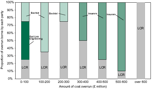 12. The Department, LCR and Bechtel negotiated the Cost Overrun Protection Programme (COPP), which the Department thought at the time was expensive. Bechtel, a key project manager on the Link and a shareholder in LCR, received £60 million for arranging the proposal. It involved carrying a £100 million share of the first £300 million of potential cost overruns, in excess of a target construction cost for Section 2, providing the overruns were not the consequence of inflation greater than a contractually determined and defined cap of 3% per annum. A group of insurers received a £27 million premium for bearing £215 million of potential cost overruns in the range £300 million to £600 million. Overruns arising from inflation greater than 3% a year were to fall on LCR and ultimately on the Department. LCR was to bear the full cost of any overruns above £600 million (Figure 3).12