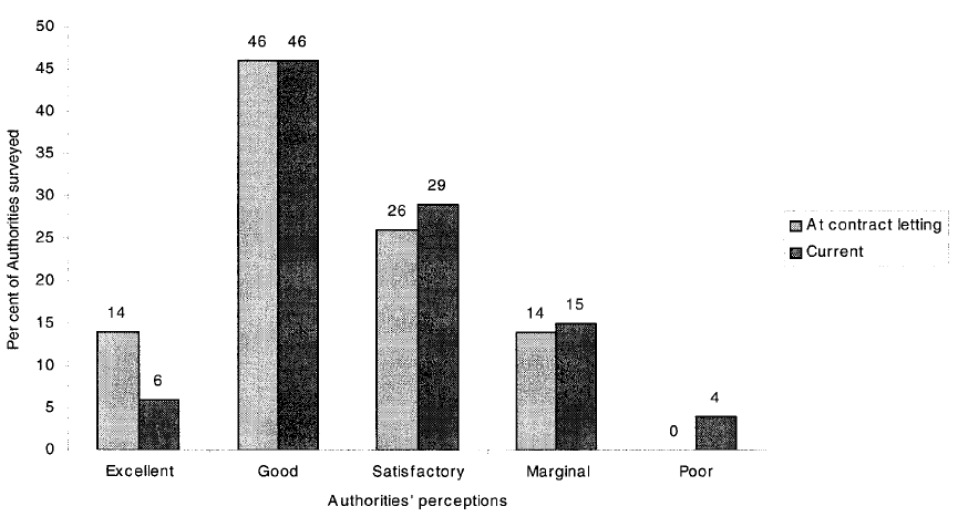 7. Responses to the NAO's survey of 121 PFI projects where contracts had been let prior to 2000 showed that 81 per cent of authorities said that the value for money of their PFI projects was currently satisfactory or better. But 15 per cent said value for money was marginal and 4 per cent said it was poor (Figure 1).4 And 23 per cent of authorities who gave a perception of value for money considered that it was not as good as at contract letting.5 We noted that the positive perceptions given by many authorities were based on a subjective impressions of what was happening on their PFI projects. Having entered into the contracts authorities were not likely to admit that they had got it wrong.6