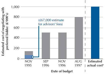■ The Agency underestimated the amount of time advisors would be engaged in preparing for and being engaged in the negotiations with CMG. We have estimated from the advisors' invoices that the Agency paid fees of nearly £1,000,000 during this stage of the procurement. Figure 8 shows the increases in the Agency's estimates for this work over the procurement period and the estimated actual expenditure.
