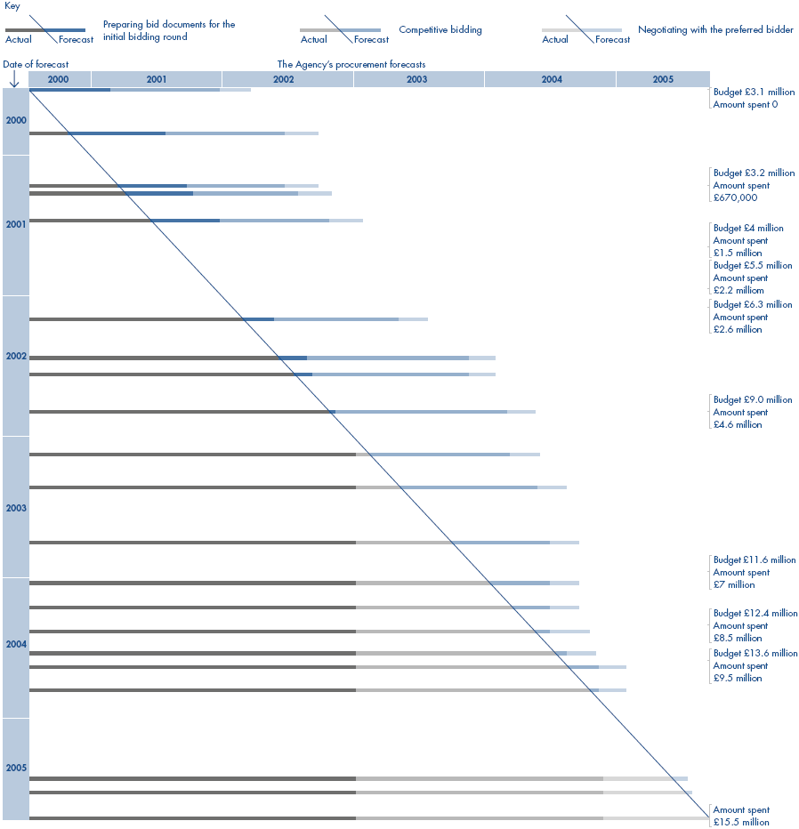 The procurement timetable progressively increased from 21 months to over five years and the budget increased from £3.1 million to £15.5 million