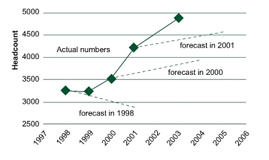 1. When Best and Final Offers were invited from bidders in 1998, the Home Office stated a requirement to accommodate 2950 staff based on a forecast reduction in its central London headquarters staff from 3200. This reduction did not occur and in fact, between 1998 and 2003, numbers increased to 4900 (Figure 1). Although the design of the building was adapted to provide for an additional 500 staff, further expansion was not possible due to the size of the site and planning restrictions. At present, total Home Office and Prison Service headquarters staff numbers are 1500 in excess of the capacity of the new building.8 The Home Office has now had to change its working assumption that the Prison Service would be accommodated at Marsham Street. In the short-term, one option was for it to remain in Abell House and Cleland House, which were currently occupied by the Prison Service and were very close to the Marsham Street building. In the longer term, the Home Office was looking at whether it could get better value for money either elsewhere in central London or outside London.9