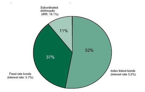 12. The bulk of the external financing for the construction phase of the project comes from two bond issues, supplemented by risk capital in the form of a subordinated loan and a small amount of pure equity (Figure 5).24