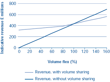 1.10 As part of the new regulatory structure, the Civil Aviation Authority has, for the first price control period to December 2005, introduced flexibility to reduce the impact of traffic fluctuations on NATS. The Company and its airline customers now each face 50 per cent of both upside and downside volume risk. If traffic were to fall by a certain amount compared to a benchmark level, set at NATS' Base Case Forecast set in November 2001, prices will automatically rise so that, all else being equal, NATS would lose only 50 per cent of the change in revenue. NATS' base case estimate represents its view of how traffic should perform over the next three years, and so already takes into account effects of traffic falls following September 11th. In addition, if traffic falls even further, below a floor meant to represent a very severe crisis, NATS' share of the lost revenue would fall to only 20 per cent. This relationship is shown in graphical form in Figure 4.