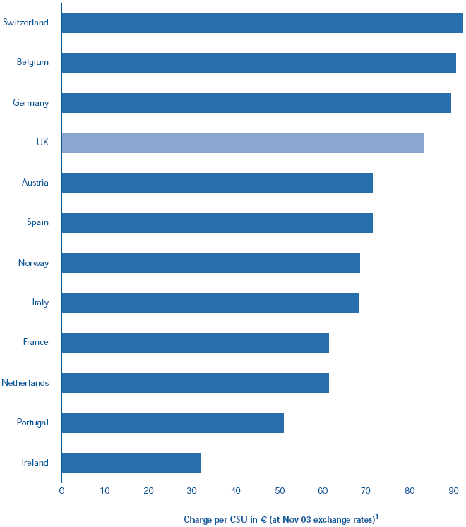 1.35 Our previous report showed that in 2001, before the PPP changes took effect, NATS' charges to Airlines for en route air traffic control were the highest in Europe. Comparisons between international charges are difficult due to different approaches to charging and to cost recovery. In addition, figures should be interpreted with caution since the picture varies from year to year due to fluctuating exchange rates and as under-recoveries or over-recoveries of cost are adjusted in later years. Figures from the published charges (the amounts actually paid by air users through the European air traffic authority Eurocontrol) show NATS to be the fourth most expensive provider (Figure 9) after Switzerland, Germany and Benelux. This appears to be broadly consistent with Eurocontrol's latest analyses of the cost effectiveness of European providers2. Generally, existing cost effectiveness measures are based on costs per kilometre with no account taken of the complexity of airspace. What is not disputed is that after the commencement of the PPP, NATS' regulated prices improved relative to those charged elsewhere in Europe, where operators raised their charges following September 11th by 12 per cent on average in 2002.