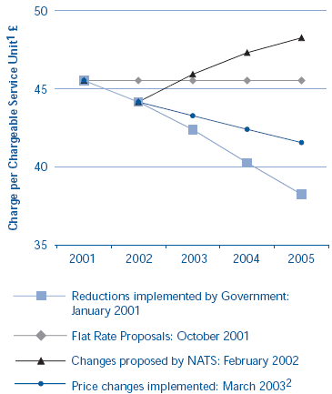 | NOTES 1 This is the Charge per Chargeable Service Unit - the unit of flight activity on which European ATC providers base their charges to airlines. One service unit is generated by a plane of 50 tonnes flying for 100km through UK airspace. Charges are expressed in Constant Prices. 2 The price changes implemented in March 2003 involve demand risk sharing. Hence the actual price is dependent on demand. The prices shown here represent those which would result if demand were as in NATS' November 2001 Base Case. Source: NATS |