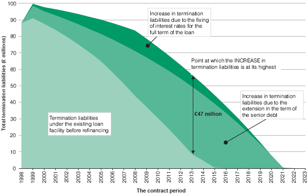 This figure shows that the maximum termination liabilities, in cash terms, vary depending on what point in the contract period termination takes place. As a result of the refinancing, termination liabilities have increased. The point at which this increase is at its maximum occurs in 2013 when there is an additional £47 million of liabilities. Source: National Audit Office from information supplied by Rothschild | |