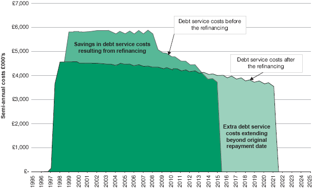2.4 In the case of Fazakerley prison, one aspect of the refinancing involved extending the term of the senior debt from 20 to 26 years. This in turn reduces the level of instalments payable by the project company in the first 20 years leaving more free cash with which to pay dividends to shareholders, albeit at the expense of less free cash in years 21 to 26 (Figure 6). The additional value that this creates for shareholders, in present value terms, is £5.2 million.