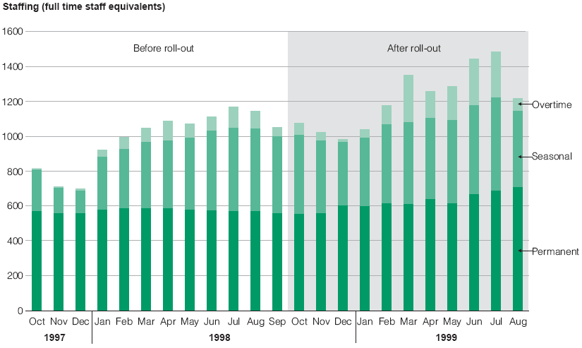 Staffing levels in the other offices (Peterborough, Glasgow, Belfast and London) increased in 1999, mainly due to overtime working but also the recruitment of extra staff. | |