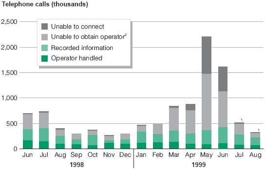 Source: National Audit Office/ UK Passport Agency | Notes: | 1. The figures for July and August 1999 exclude calls to the call centre - 218,000 in July, 46,000 in August. 2. "Unable to obtain operator" represents those callers who, on connection, opted to speak to an operator but were unable to do so. | |