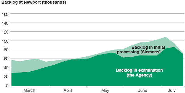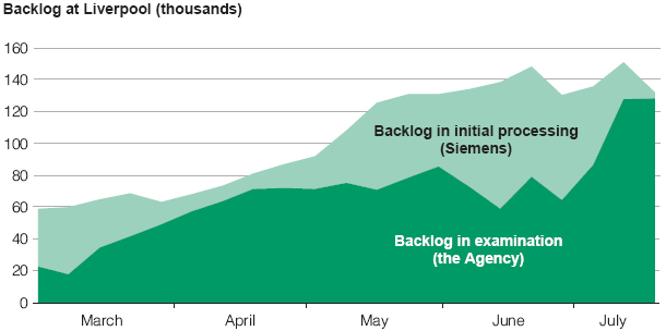 Backlogs in Liverpool and Newport grew in the period up until July, both in initial processing and the examination stage. | ||