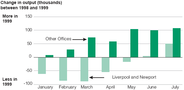 3.5 By the end of February, however, the Agency had serious concerns about its ability to cope. Although output at Liverpool and Newport increased in early 1999 the increase was slower than expected. The Agency needed to urgently increase output from its other offices, beyond normal seasonal levels, to make up for lost output at Liverpool and Newport. Figure 20 shows that output from the other four offices increased significantly in March and remained ahead of the previous year's output level in subsequent months. This increase in output was not sufficient to cope with the surge in demand.