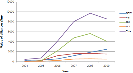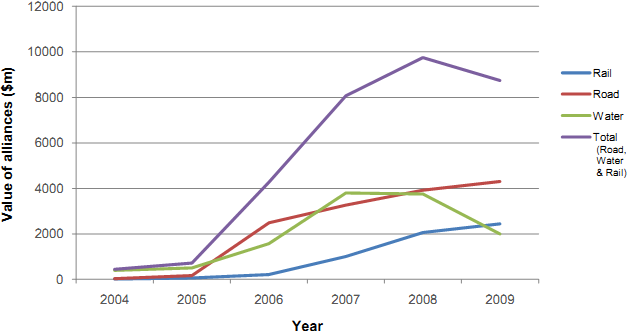 The number and value of projects undertaken using the alliance delivery method has also grown over the past five years. The total value of alliance projects in the road, rail and water sectors in New South Wales, Victoria, Queensland and Western Australia, over the period 2004 to 2009 was $32 billion.