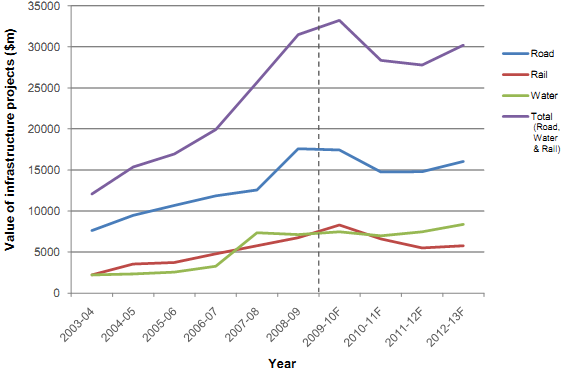 Public and private sector expenditure on infrastructure projects in the Australian road, rail and water sectors has grown significantly from 2003 to 2009, increasing from $12 billion per annum in the 2003 to 2004 financial year to $32 billion per annum in the 2008 to 2009 financial year as shown in Figure 2.1.