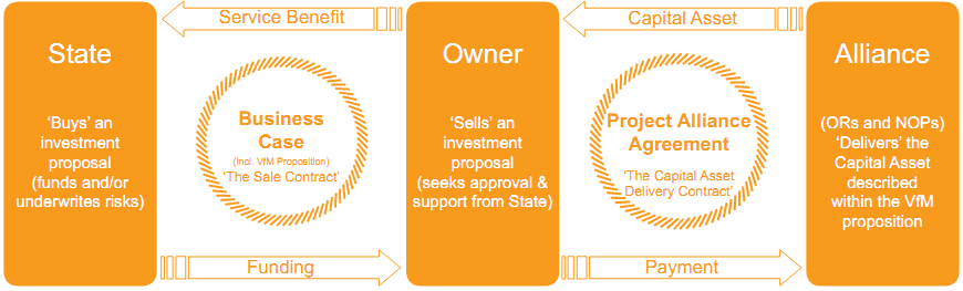 The alliance team (i.e. the ORs and the NOPs) is appointed to deliver the capital project component of the business case. Whilst it is the role of the alliance team to plan, design and construct the project, it must do so within the parameters set by the business case approvals and it has no authority to change the business case. If any change is considered necessary, it must be approved by the Owner; and if there are significant changes outside agreed governance thresholds, by the government. (Normally government processes operate on the basis that the original approver of the business case needs to approve any material changes to that business case.)