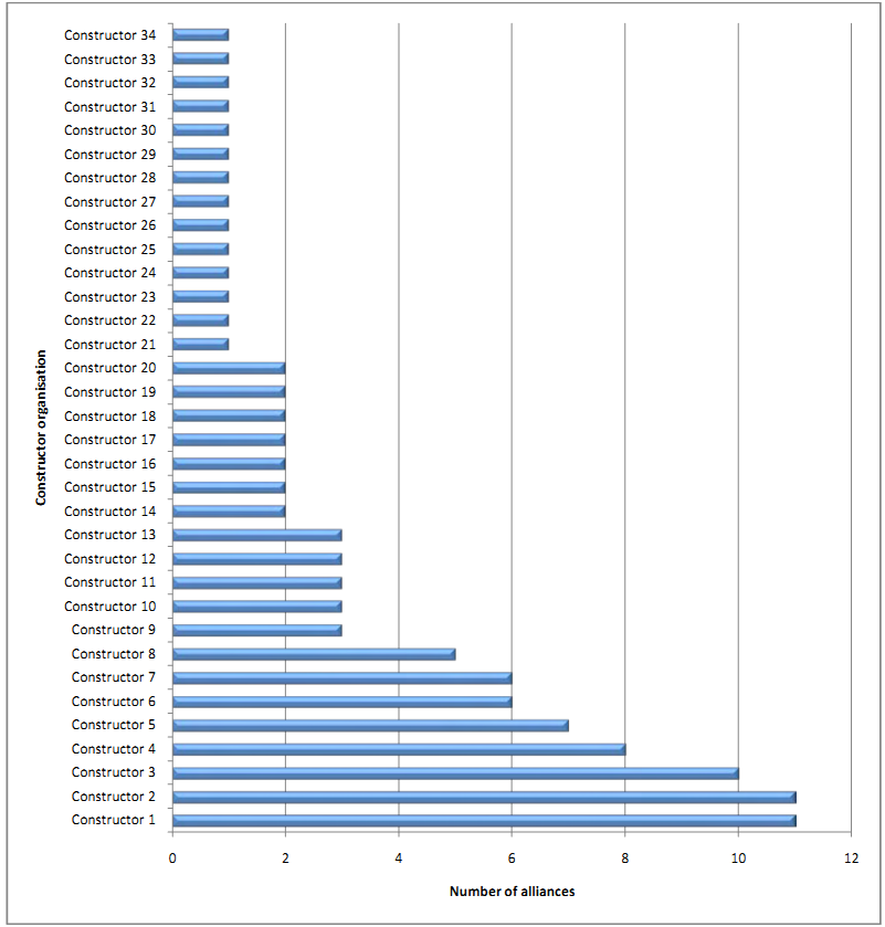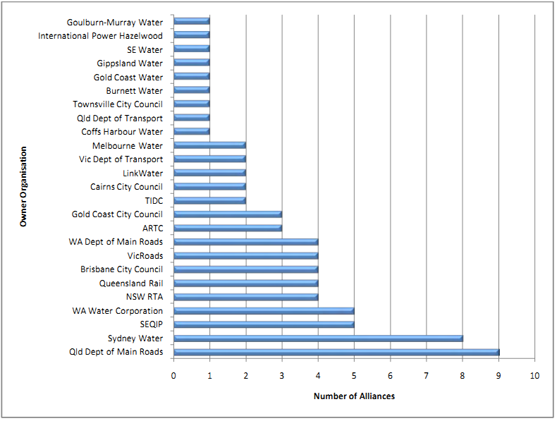 Figures 1-3 list out the alliances that surveyed organisations have participated in. The data was gathered from the condensed Alliancing Association of Australasia inventory of alliances.