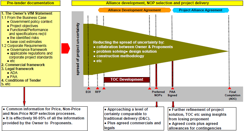 There are two primary objectives of the TOC development process. The most obvious is to arrive at a TOC that is acceptable to both the Owner and the NOPs and for the Owner to have confidence that the TOC reflects a Project Proposal that will satisfy the Owner's VfM Statement at a fair cost at project completion (i.e. the AOC). The second objective is to give the Owner insight into its potential alliance partners to deliver a success outcome prior to entering a PAA. The process of developing the TOC provides the Owner with a high degree of assurance and understanding of the solution and allows them to participate effectively in project delivery.