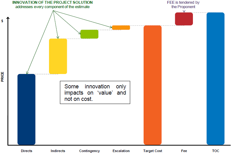 Historically, in non-price selection a disproportionate level of attention is often focussed on the NOPs Fee. The Fee is usually of the order of 10% of the total TOC. The weight of focus of the Proponent and the Owner should be on the balance of the project price, representing the estimated cost of delivering the Project Solution. It is the Project Solution represented by the design solutions, construction methods, procurement and project management approach and contingency and escalation allowances that have a far greater impact on TOC and the VfM proposition to the Owner than the NOPs Fee.