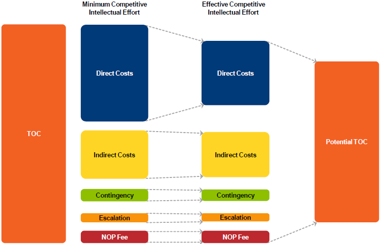 Competition enhances the application of intellectual effort on the Project Solution by improving the offered delivery solution and thereby impacting on Direct Costs and thereafter on reducing the remaining TOC components as shown in Figure 17 below. This illustrates the positive effect that competition has on costs and quality outcomes.