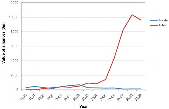 Figure 2.5 compares the public sector and private sector use of alliancing.