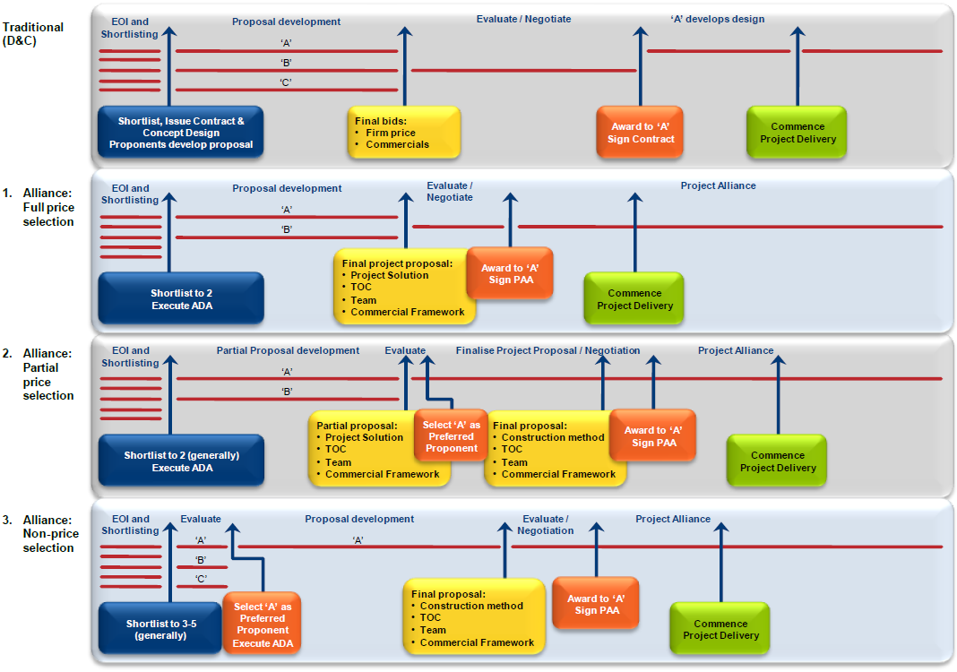 Figure 5.2 compares the three selection processes with a more traditional D&C selection process. The diagram shows the progression to select the Preferred Proponent in each selection process, which is broadly similar except for the Non-price process where the Preferred Proponent is selected without a competitive Alliance Development Phase.