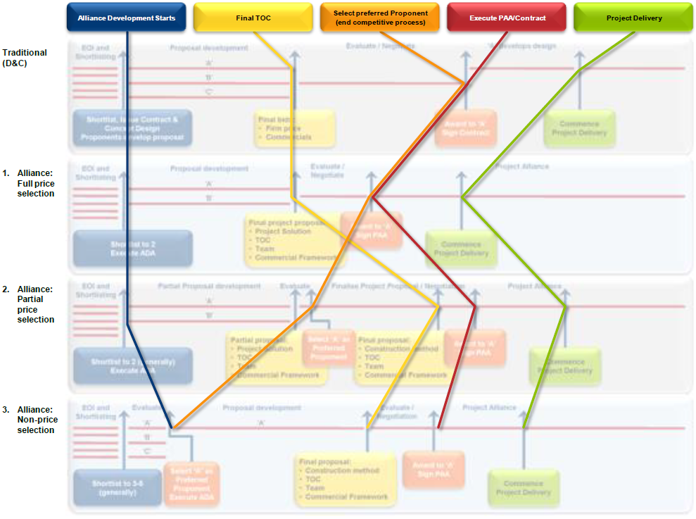 Recognising that the times are indicative and will vary between projects, it is noteworthy that all processes lead to similar commencement dates for project delivery since this is contingent upon agreeing the Final TOC and executing the PAA.